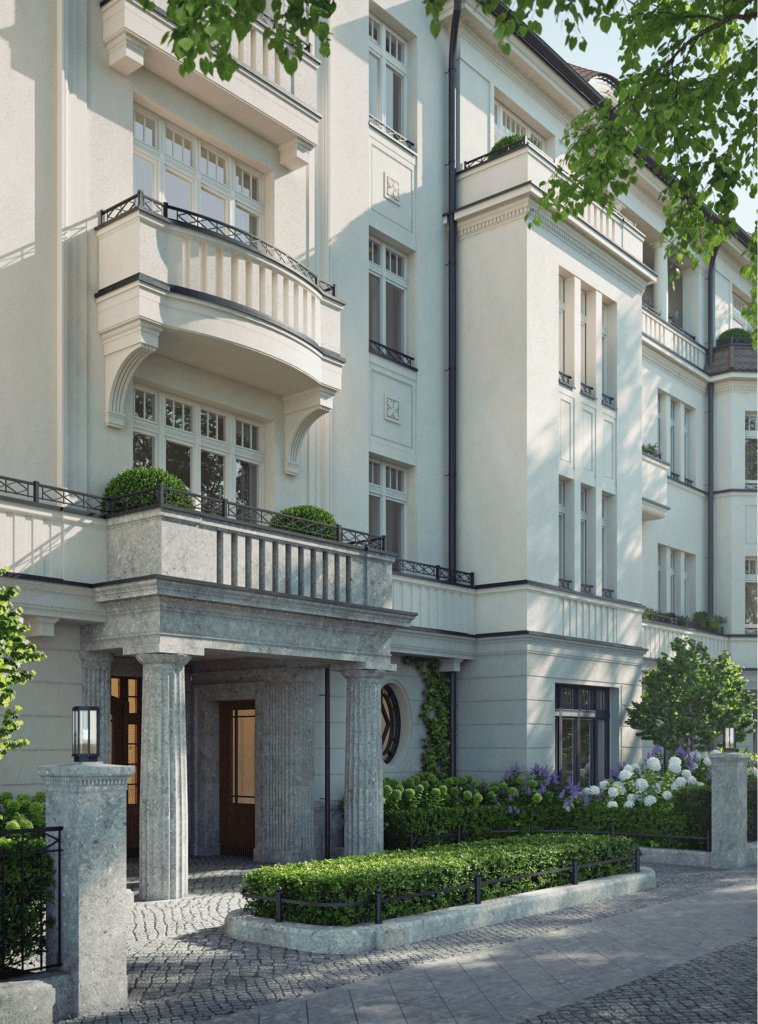 | Fassade | Inspiriert von den in Schmargendorf vielfältig vorzufindenden Beispielen der Reformarchitektur ab 1900. Elegant proportionierte Erker tragen Balkone, die von großzügigen Loggien flankiert werden. Balustraden, Säulen und schmiedeeiserne Elemente beleben die helle Fassade |