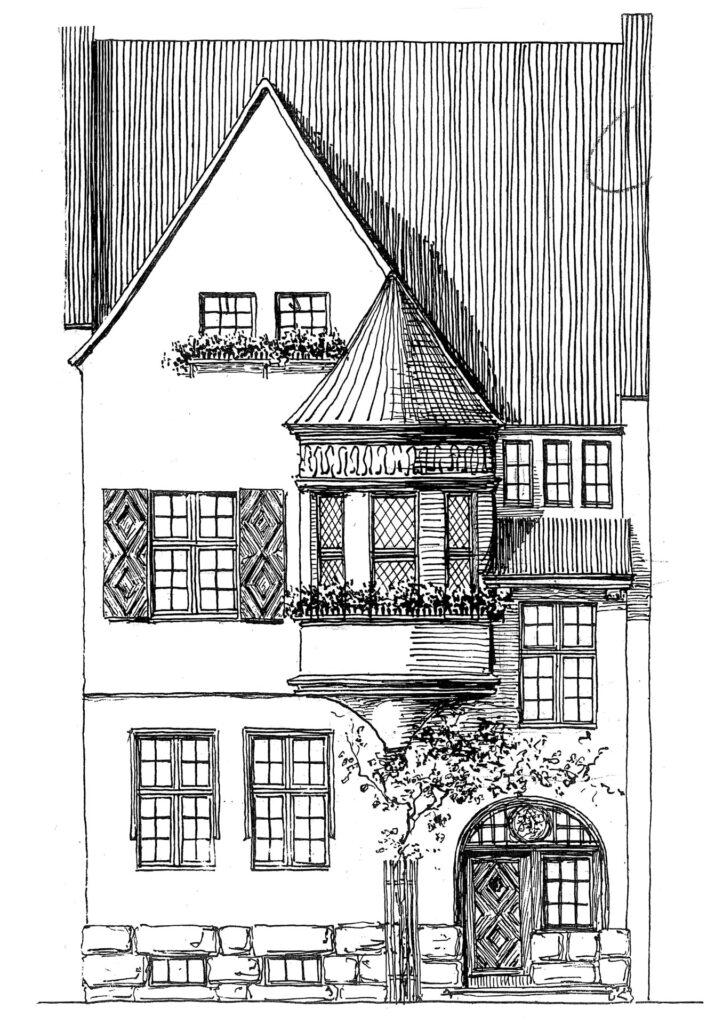 Die herrschaftliche Villa von 1910 wurde vor einigen Jahren außen und innen aufwendig kernsaniert und renoviert. Typische historische Stilelemente, wie markante Erker, Sprossenfenster mit Läden und das elegante dunkle Steildach mit Giebel, prägen das Baudenkmal. Ein dezenter Natursteinsockel erdet die helle Fassade mit ihren zurückhaltenden Schmuckdetails und dem noblen, leicht zurückgesetzten Eingangsportal.