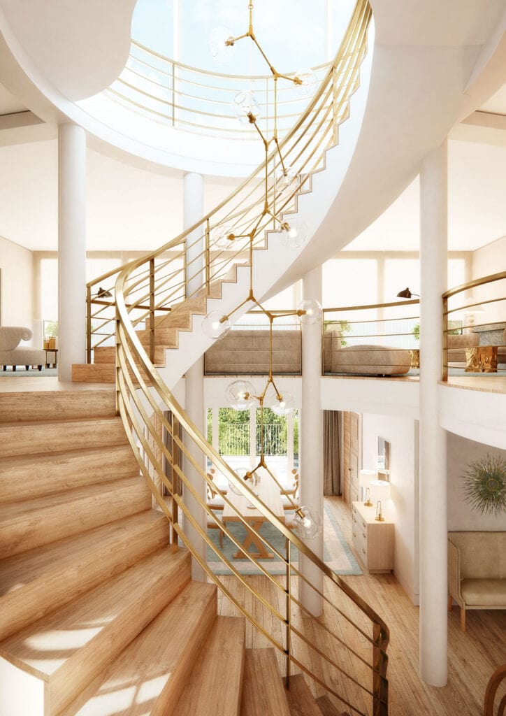 Ein elegantes Foyer im Erdgeschoss bietet das repräsentative Willkommen für die darüberliegenden sechs Etagenwohnungen mit bestem Blick auf den Rhein. Krönung ist das Triplex-Penthouse über die drei obersten Etagen: Innen mit einem offenen Säulengang versehen, verbindet eine aufsehenerregende Wendeltreppe die Ebenen des einzigartigen Refugiums. Mit dem privaten Aufzug gelangt man über jede der Etagen bis hinauf zum zugehörigen Dachgarten mit Pavillon – zweifelsohne eine der wohl exklusivsten Penthouse-Wohnungen Düsseldorfs.