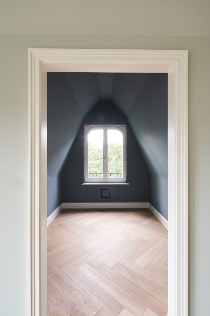 - Maßgefertigte und lackierte Zimmertüren mit aufgesetzten Zierprofilen und Bauhaus-Beschlägen