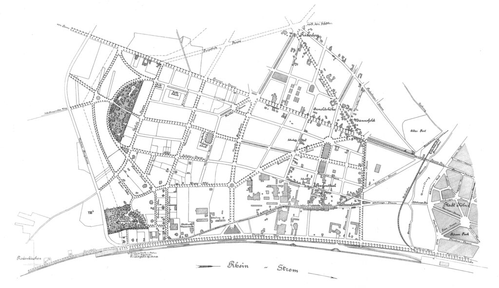Denkmalgeschütze Platanen zieren die Allee, die das neue Gebäude säumt: die Brohler Straße, gegründet um 1900. Ihren Namen verdankt sie dem rund 50 Kilometer rheinabwärts gelegenen Ort Brohl im Landkreis Ahrweiler – mit Einrichtung einer direkten Eisenbahnlinie um dieselbe Zeit wurde das Brohltal zum beliebten Ausflugsziel der Kölner, wie auch Marienburg selbst.