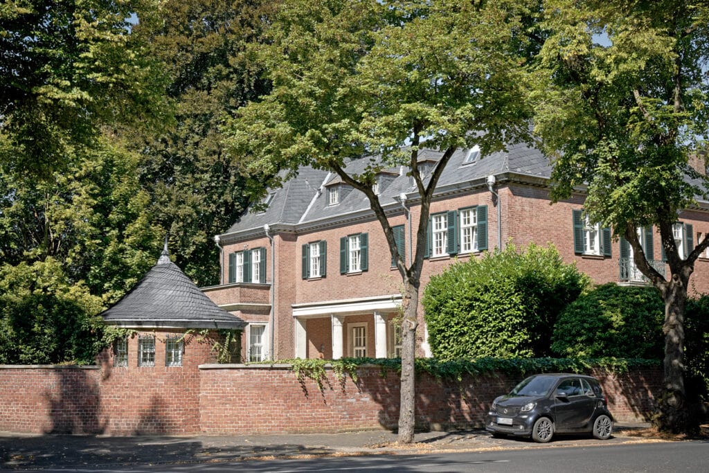 Ganz im Vertrauen: Die „richtige“, das heißt die gehobenere Rheinseite Kölns ist natürlich die linke. Und von den offiziell 86 Veedeln, wie die Stadtviertel in Kölner Mundart heißen, ist Marienburg das nobelste, ein außergewöhnliches Exempel der Entwicklung und Entstehung einer Villenkolonie und ein Paradebeispiel dafür, welche dauerhafte Schönheit sorgfältige Planung und Umsetzung hervorbringen kann. Und das kam so: 1864 hatte Ernst Leybold, Kaufmann in Köln, seinem Pharmaziehandel so wirkungsvoll zum Aufschwung verholfen, dass er ein Hauptgeschäft in der Schildergasse eröffnen konnte (zufällig im selben Jahr, als nur einige Meilen weiter am Niederrhein Peter Heinrich Schmitz unser Familienunternehmen gründete). Wenige Jahre später verliebte sich Leybold, mittlerweile erfolgreicher Industrieller, bei einem Spaziergang Hals über Kopf in die Schönheit der damals noch nahezu unberührten Landschaft vor dem Kölner Zentralring, auf der idyllischen Seite des Rheins. Kurzerhand erwarb er das dort gelegene Anwesen Marienburg, zu der Zeit ein Gutshof, mitsamt riesiger Ländereien – und mit einer Vision, der er sein Leben lang folgen sollte: 1876 startete die langgeplante Initiative für eine „Villencolonie“ durch Gründung der Immobiliengesellschaft Marienburg. Ein neuer Bebauungsplan der Stadt Köln, die Marienburg 1888 eingemeindet hatte, ermöglichte es Ernst Leybold und seinen Partnern schließlich, das ambitionierte Projekt ab 1896 endlich anzugehen.