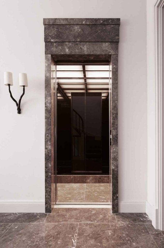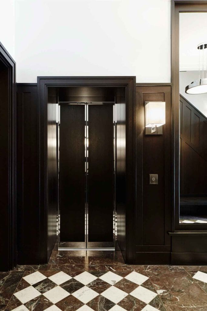 Im Stil der großen Metropolen zeigt sich der Fahrstuhl von Haus Weyhe. Ob es an dem tiefbraun gebeizten Eichenfurnier, dem schimmernden Chrom oder dem kunstvoll verlegten Naturstein liegt, dass man bei dem Anblick dieses Gefährts an große Apartmenthäuser wie das New Yorker Dakota-Building erinnert wird, bleibt dahingestellt. Sicher ist jedoch, dass sich die internationale Formensprache mühelos in RALF SCHMITZ-Interieurs einfügt und das Ankommen in dem Berliner Domizil zu etwas Besonderem macht.