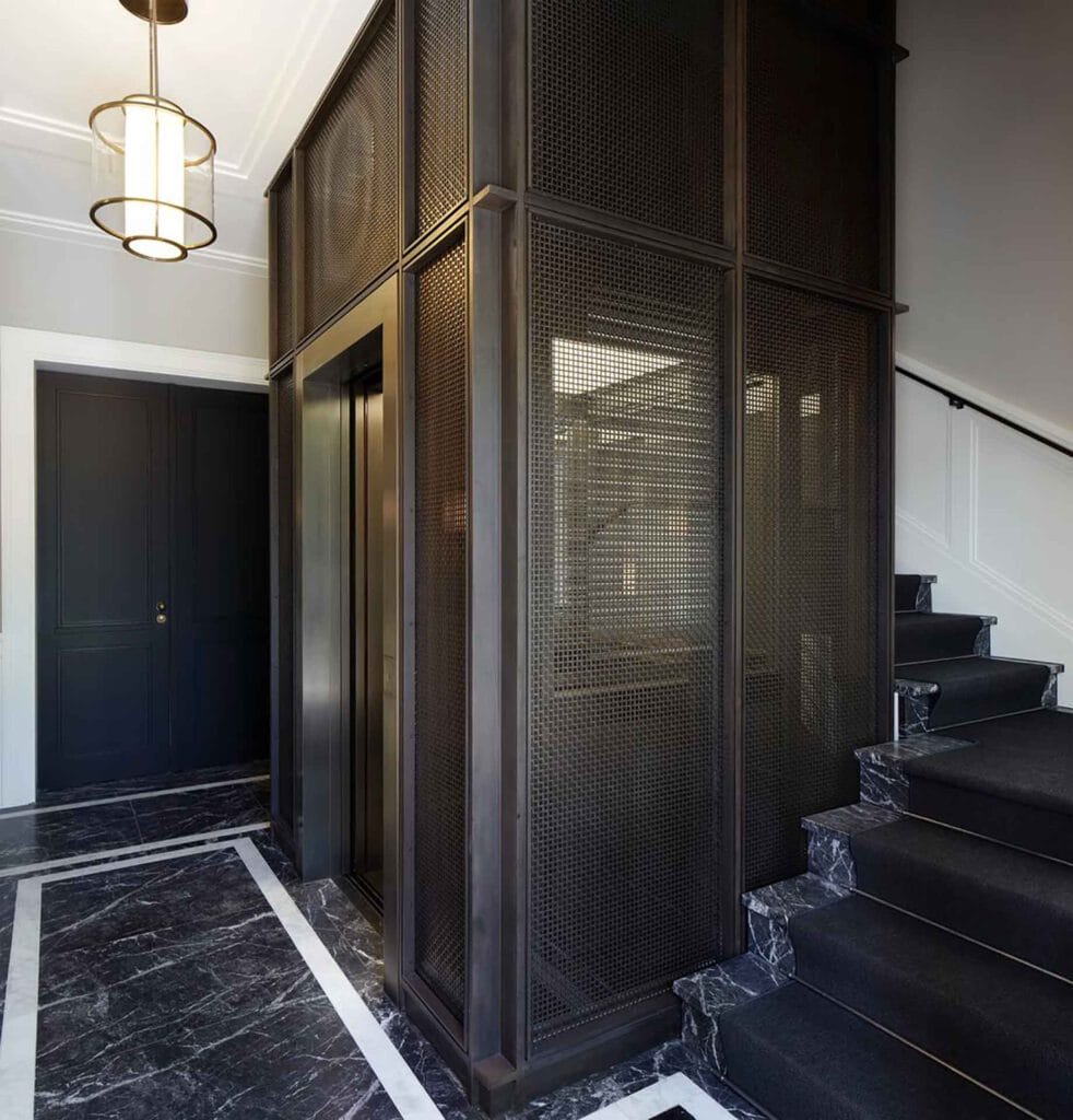 Vereinfachte Formen, gewagte Materialien und markante Geometrie sind die drei wesentlichen Grundlagen für den eindrucksvollen Aufzug im Stil des Art Déco, der im einladenden Foyer von Haus Hardt in Berlin-Grunewald seine Fahrgäste empfängt. Edle Materialien wie das filigrane Messinggeflecht und eleganter Naturstein erfordern hochwertigste Handwerkskunst, um ein so geschmackvolles Interieur zu erschaffen – RALF SCHMITZ arbeitet mit einem festen Kreis von Handwerkern, die solch anspruchsvolle Architekturdetails versiert auszuführen wissen.