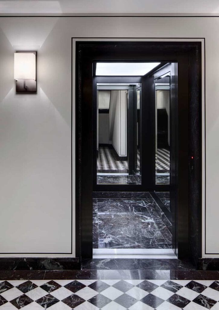 Die Stattlichkeit des Düsseldorfer Apartmenthauses „Unter den Linden“ im Trendviertel Flingern spiegelt sich außen wie innen. RKW Architekten, die die Planung des Objektes durchgeführt haben, gingen auch bei der Gestaltung des großzügig wirkenden Lifts mit großer Sorgfalt und viel Liebe zum Detail vor: Durch eingefasste Spiegel, coolen Marmor und klare Schwarz-Weiß-Kontraste passt sich die zeitgenössische Innenarchitektur seiner modernen Bewohnerschaft im Norden der Rheinmetropole perfekt an.