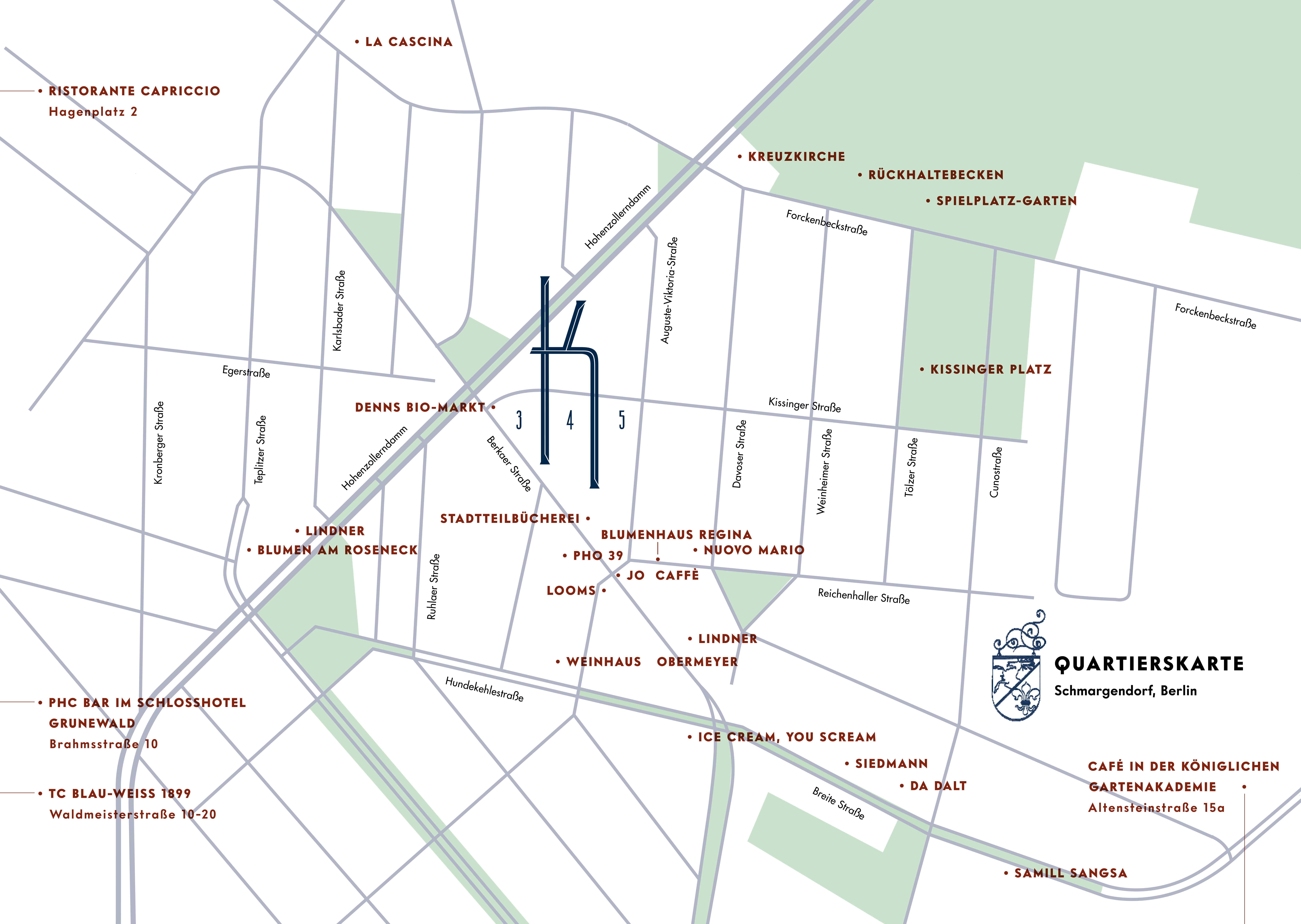 Die Umgebung der Kissinger Straße ist geprägt von angenehmer Gelassenheit. Familien schätzen den Spielplatz-Garten an der Forckenbeckstraße mit Wasserbereich, Klettergerüsten und Tischtennisplatte. Literaturfreunde zieht es in die atmosphärische Stadtteilbibliothek im Sandsteinkeller des Rathauses, wo einst auch Rainer Maria Rilke lebte und seine „Schmargendorfer Tagebücher“ schrieb. Nur ein paar Straßen weiter zeigen das Brücke-Museum und die Galerie Bastian große Werke der Klassischen Moderne – eingebettet in Grün und Stille am Rand des Grunewalds.