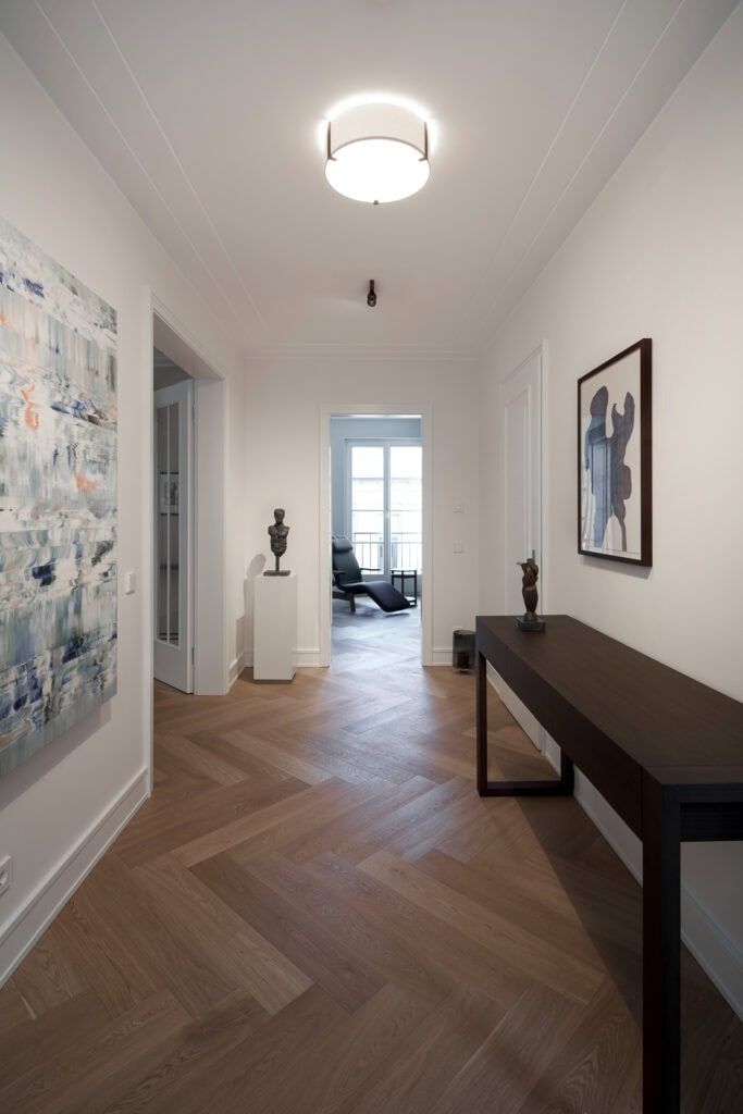 - Böden aus Eiche, eleganten Natursteinen und Feinsteinzeug mit Fußbodenheizung