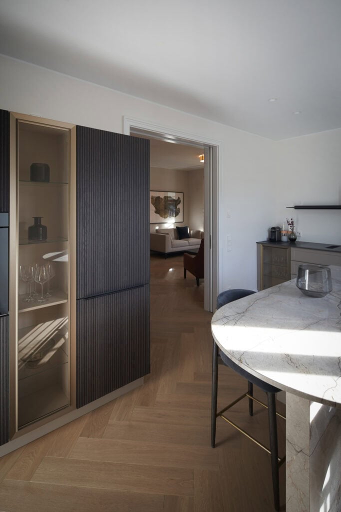 - Die maßgefertigte Küche vereint geschwärztes Eichenholz, Vitrinen in Manganbronze und eine Natursteininsel aus „Silver River“-Marmor.
