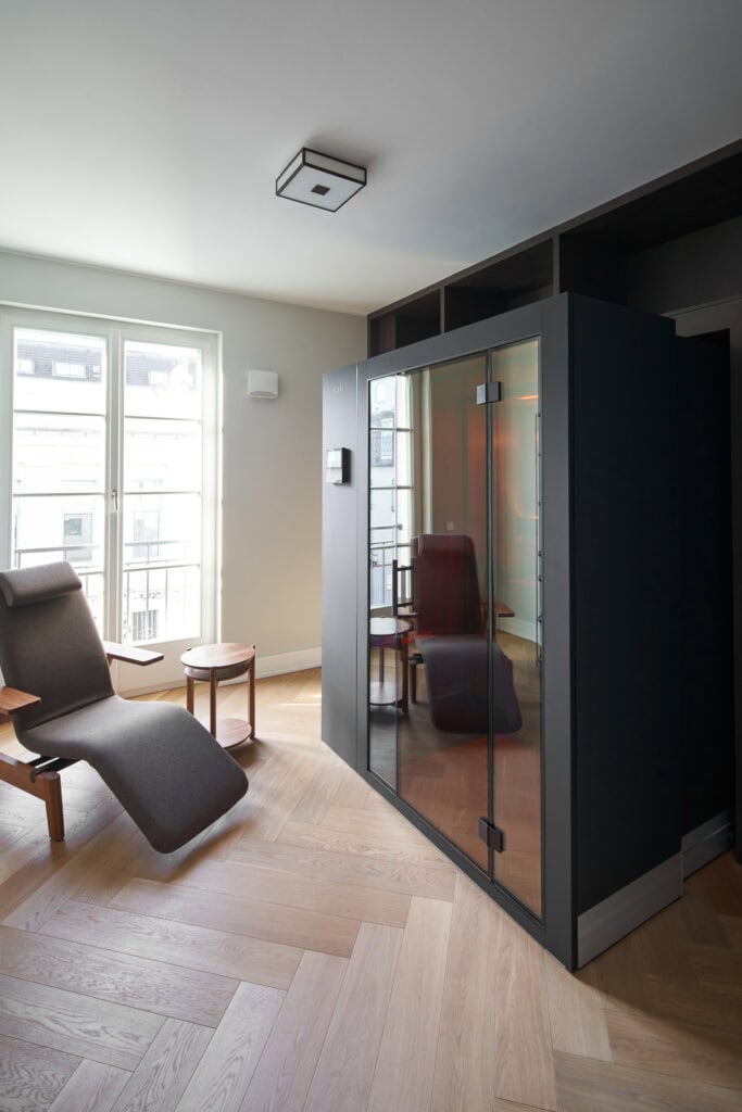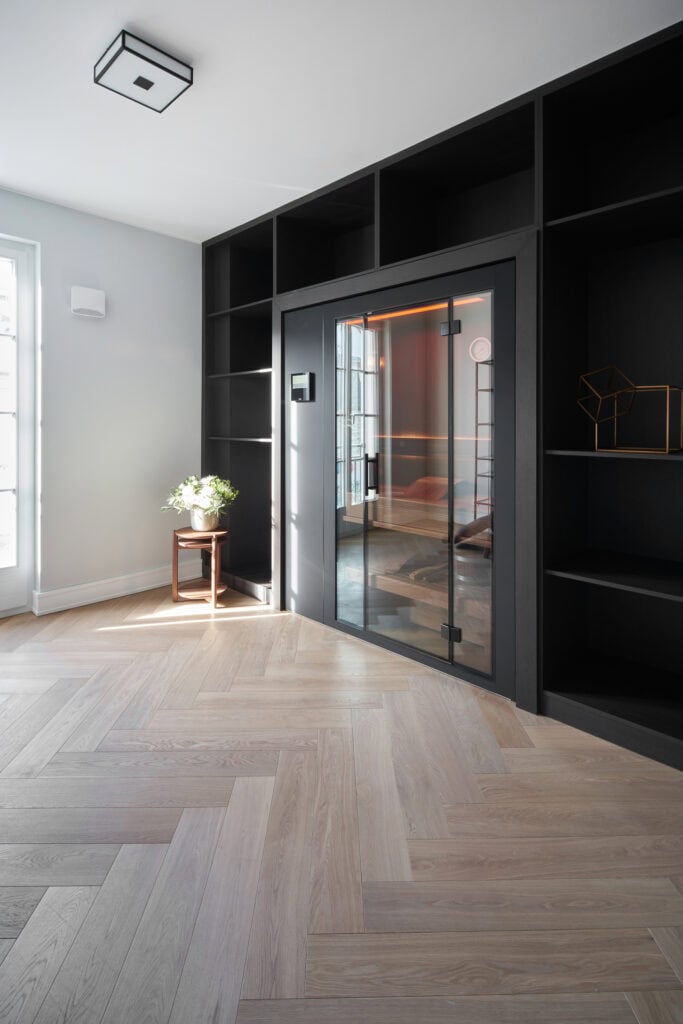 Ein besonderes Highlight: die ausziehbare Sauna S1 von KLAFS, mit bronzefarbener Glasfront und edlem Nussbaum-Innenausbau – stilvoll integriert, technisch raffiniert.