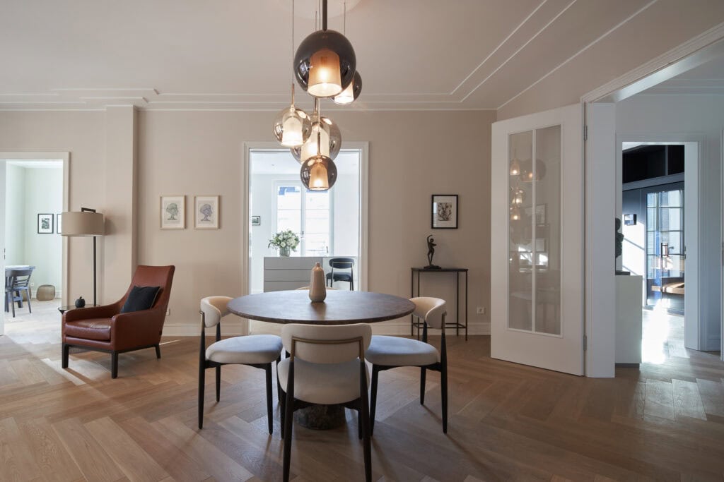 Auch die Möblierung zeugt von kuratierter Gestaltung: ein Esstisch aus Emperador-Marmor, Stühle aus schwarzer Eiche mit Bronzedetails, ein Sessel aus cognacfarbenem Leder und eine Pendelleuchte aus Borosilikatglas schaffen eine ruhige, luxuriöse Atmosphäre.